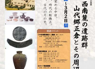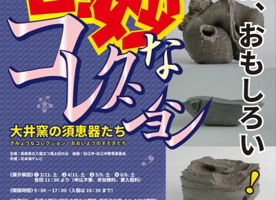 開催中の展覧会 展示学習館 令和7年度冬季企画展「茶臼山西南麓の遺跡群 ~ 山代郷正倉とその周辺 ~」 開催期間 令和7年12月24日(水)~令和8年3月2日(月) 開館場所 島根県立八雲立つ風土記の丘展示学習館 開館時間 9:00~17:00(最終入館16:30) 詳細を見る 開催予定の展覧会 展示学習館 令和8年春季企画展『奇妙なコレクション ― 大井窯の須恵器たち ―』 2026年3月18日(水)~6月15日(月)