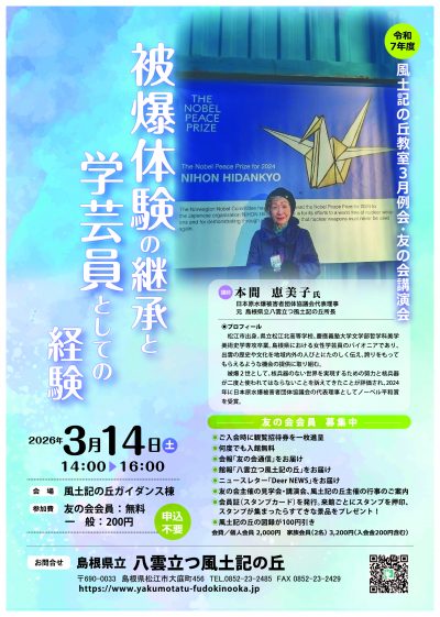 開催前のイベント 令和7年度風土記の丘教室3月例会・友の会講演会 2026年3月14日(土) ~2026年3月14日(土) 基本情報 開催期間 2026年3月14日(土) ~2026年3月14日(土) 14:00-16:00 会場 島根県立八雲立つ風土記の丘ガイダンス棟 講師 本間恵美子先生 費用 友の会会員:無料 一 般:200円