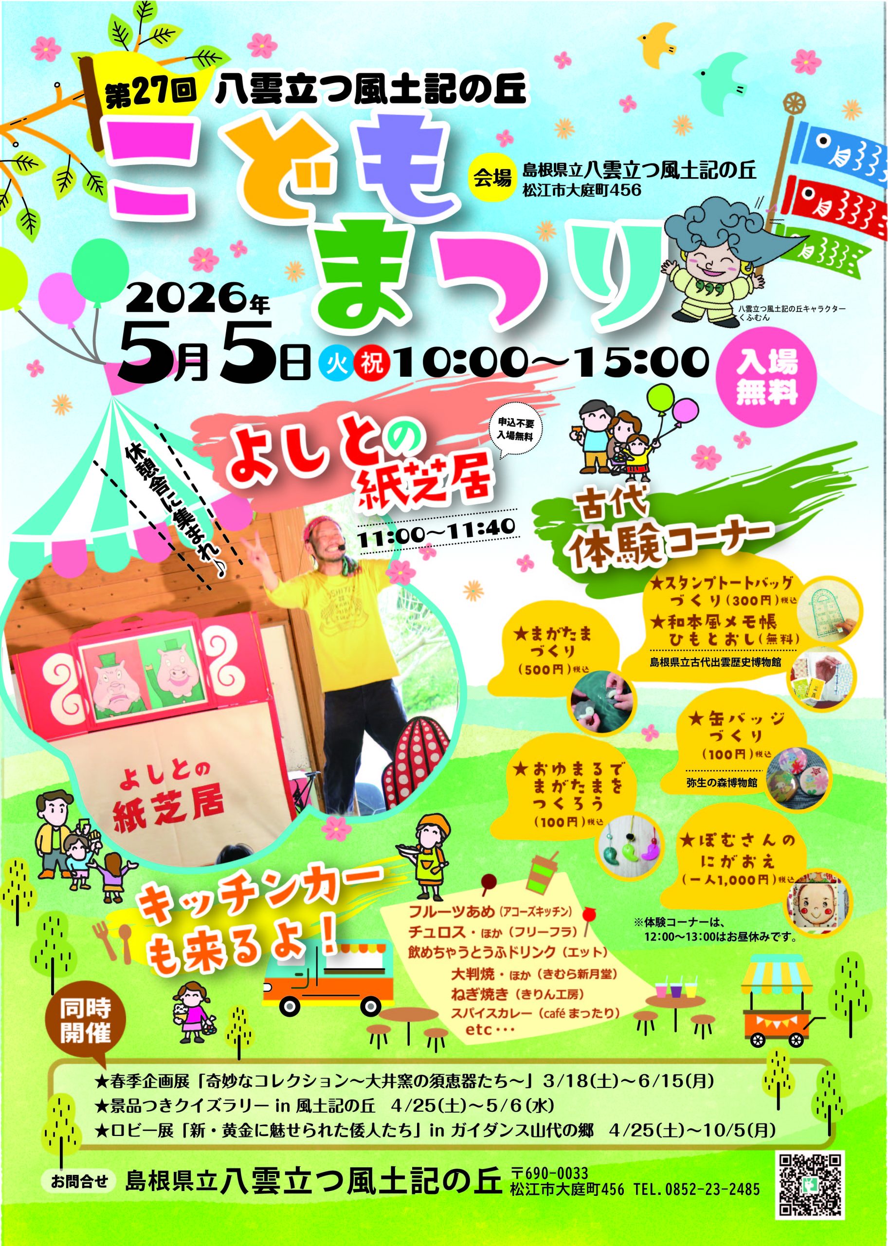 開催前のイベント こどもまつり 2026年5月5日(火) ~2026年5月5日(火) 基本情報 開催期間 2026年5月5日(火) ~2026年5月5日(火) 10:00~15:00 会場 島根県立八雲立つ風土記の丘